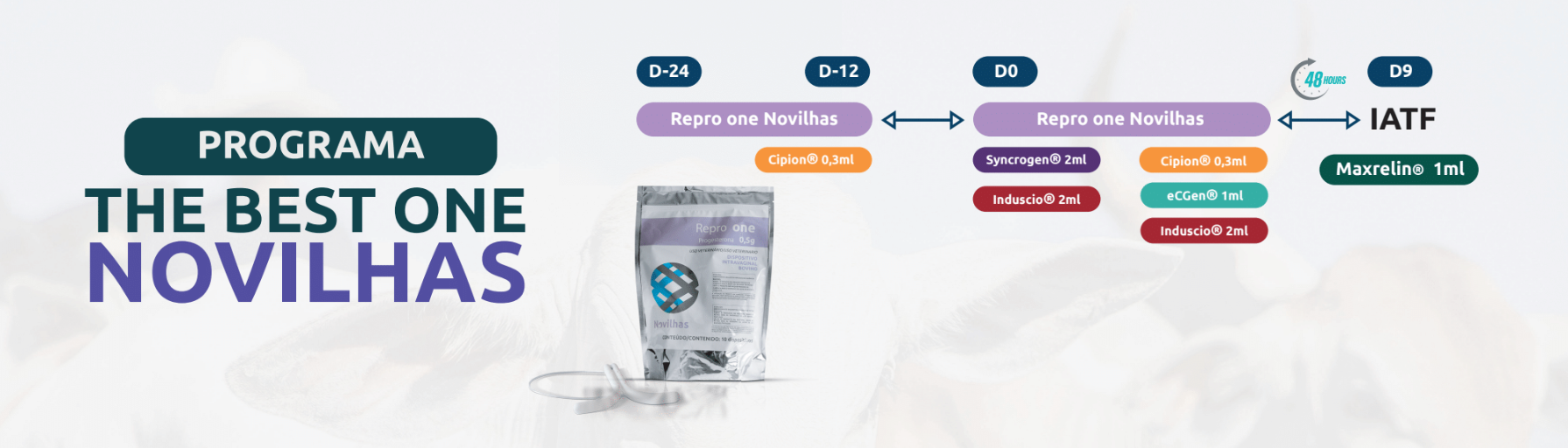 Nele, é preconizado o uso do dispositivo intravaginal de progesterona Repro One Novilhas, implante especialmente adaptado à anatomia das novilhas. Esse ajuste no dispositivo faz com que haja redução do desconforto, do estresse e da incidência de vaginite em comparação aos dispositivos tradicionais. As adaptações anatômicas também contribuem para menor liberação de cortisol e melhor ganho de peso durante o protocolo.